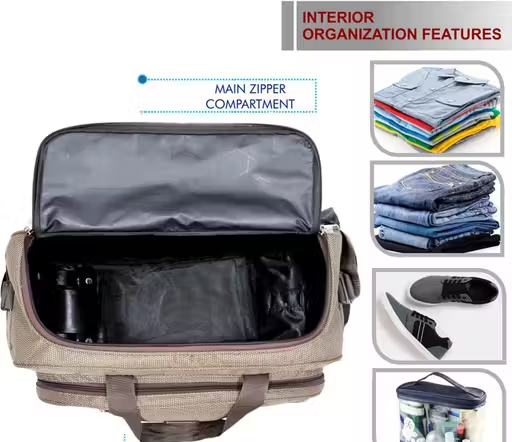 The spacious main compartment provides ample room to store clothes, shoes, travel essentials, and accessories. It features sturdy handles and an adjustable shoulder strap for comfortable carrying.