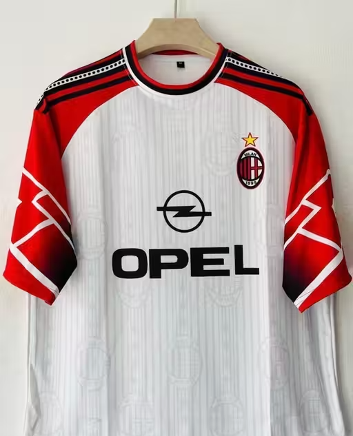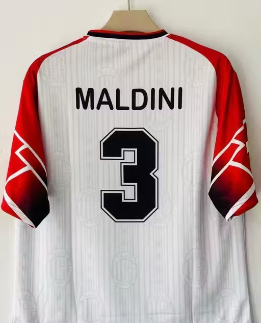 Classic AC Milan away jersey featuring Maldini #3 with a clean white base and iconic red detailing. Designed for a timeless look, this jersey is perfect for football fans and collectors.