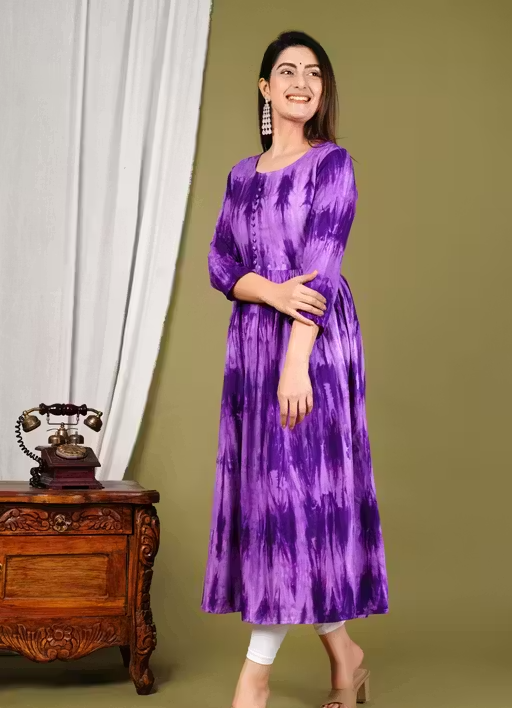 This stylish Anarkali kurti is designed to give a graceful and elegant look. Made from soft rayon fabric, it offers a comfortable and breathable feel, making it ideal for all-day wear.