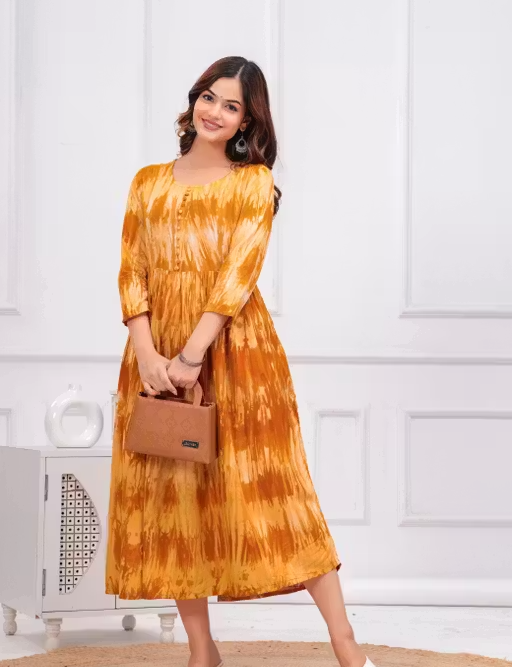 This stylish Anarkali kurti is designed to give a graceful and elegant look. Made from soft rayon fabric, it offers a comfortable and breathable feel, making it ideal for all-day wear.