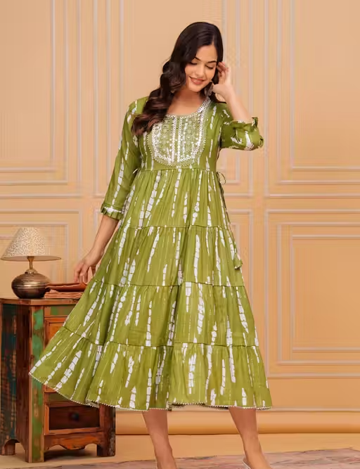 The Anarkali silhouette creates a flowy and flattering fit, while the three-quarter sleeves add a balanced and fashionable touch. The printed design with embroidery detailing enhances its overall appeal, making it suitable for various occasions.