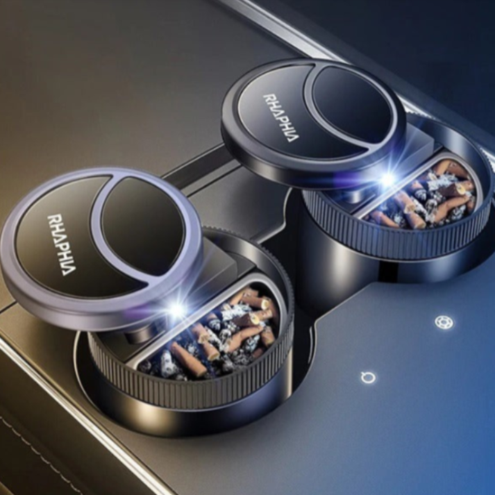 Design: Compact cylindrical ashtray with flip-top lid and soft blue LED light inside