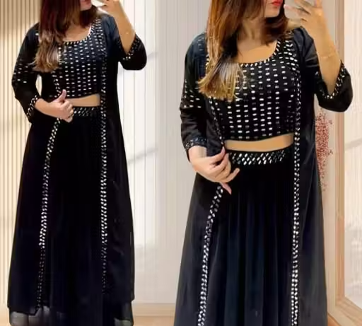 Make a bold and elegant statement with this stunning black gown set, crafted from premium georgette fabric. Designed in a stylish Indo-western look, this outfit features a printed top paired with a long flared skirt—perfect for weddings, parties, and festive occasions.