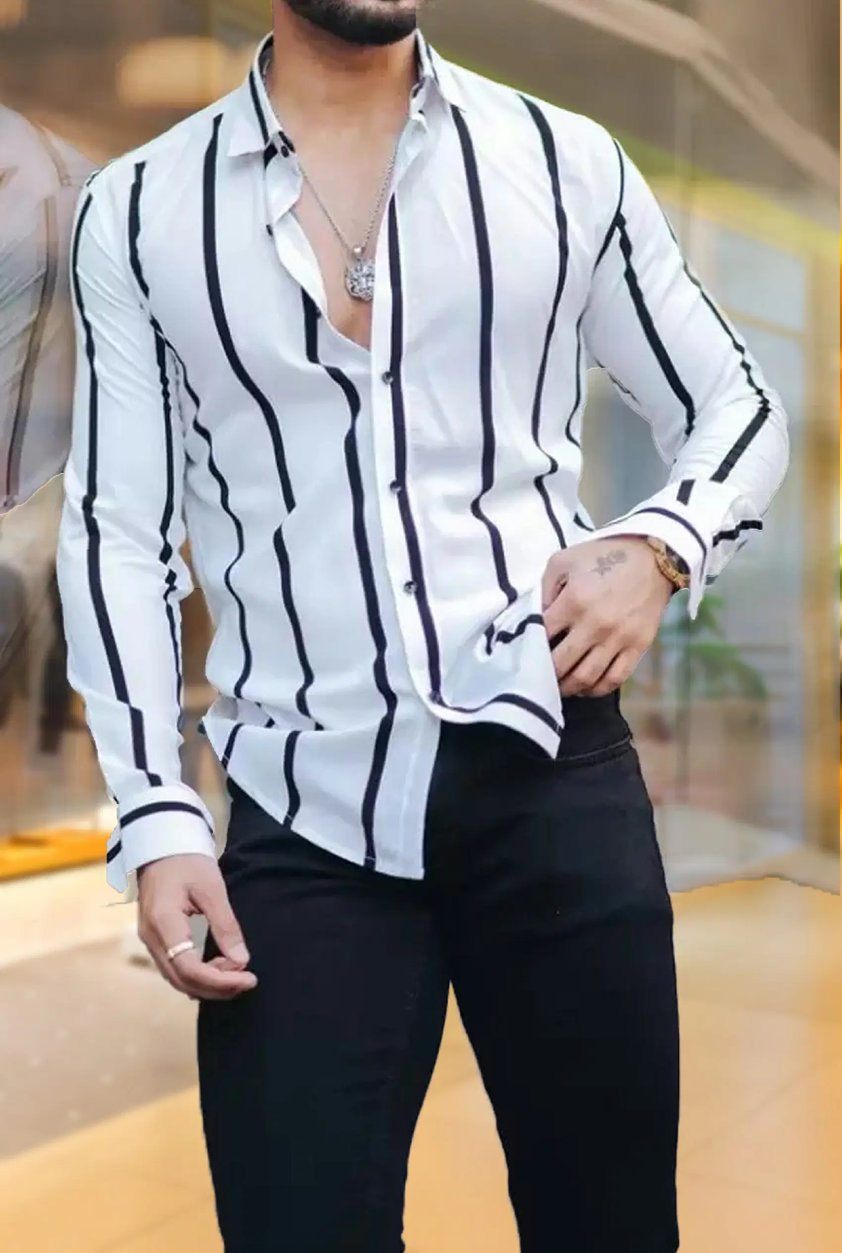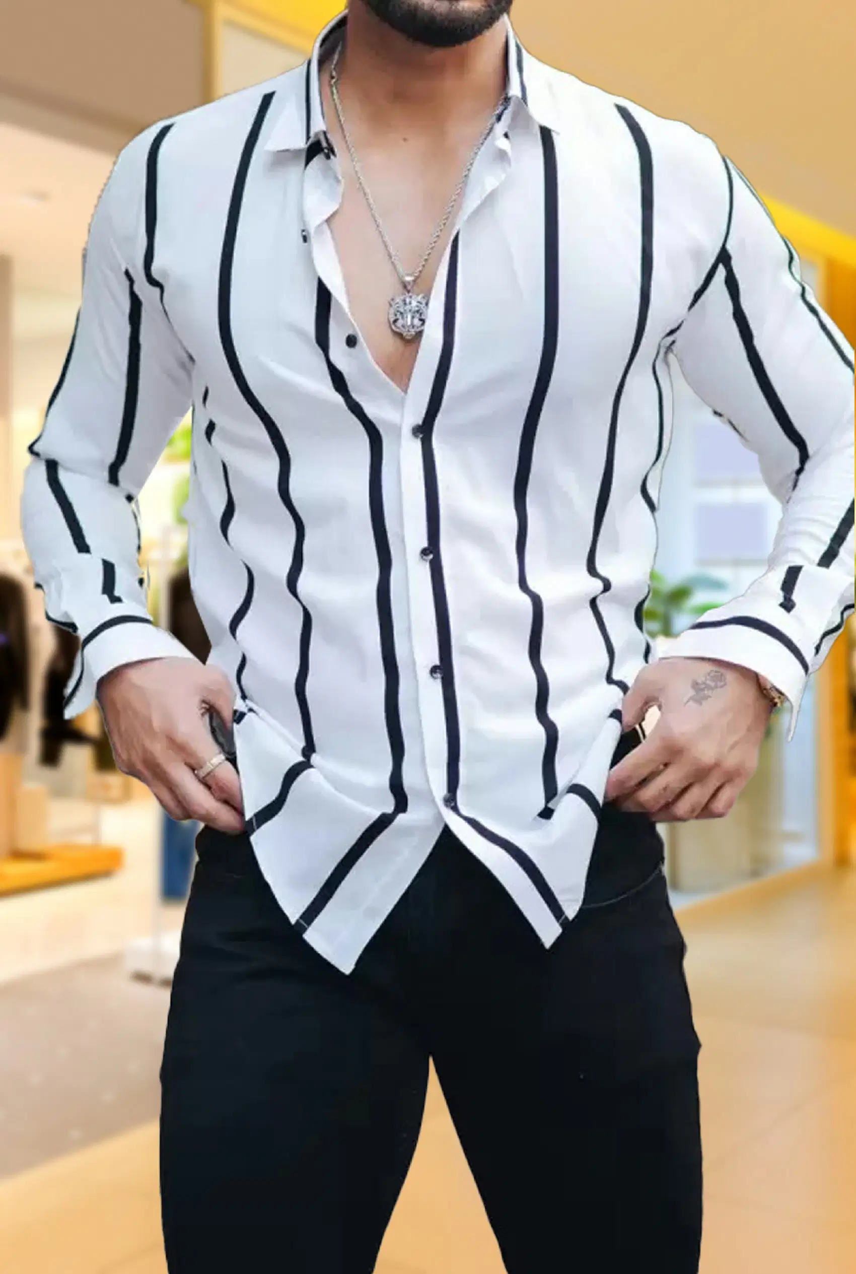 Upgrade your fashion game with this stylish men’s white vertical striped casual shirt, designed for a sharp and confident look. Featuring bold black vertical stripes on a clean white base, this shirt creates a slimming effect and adds a modern edge to your outfit.