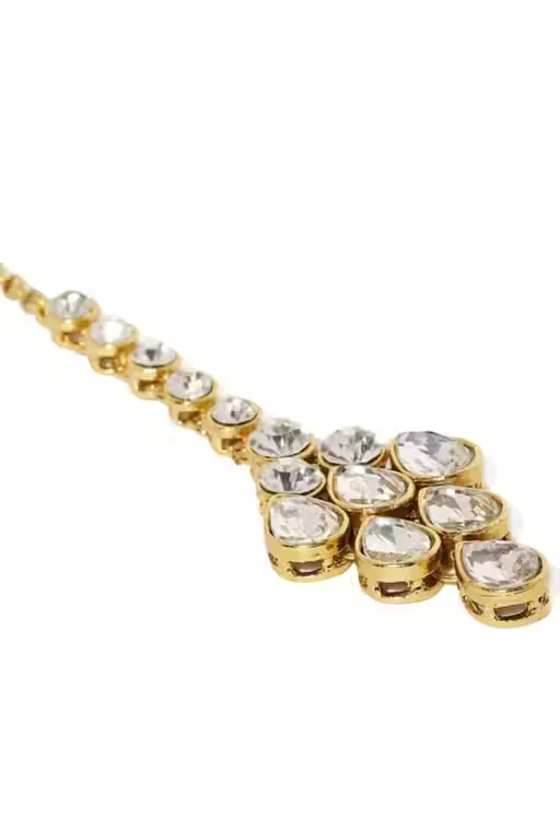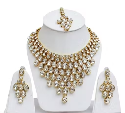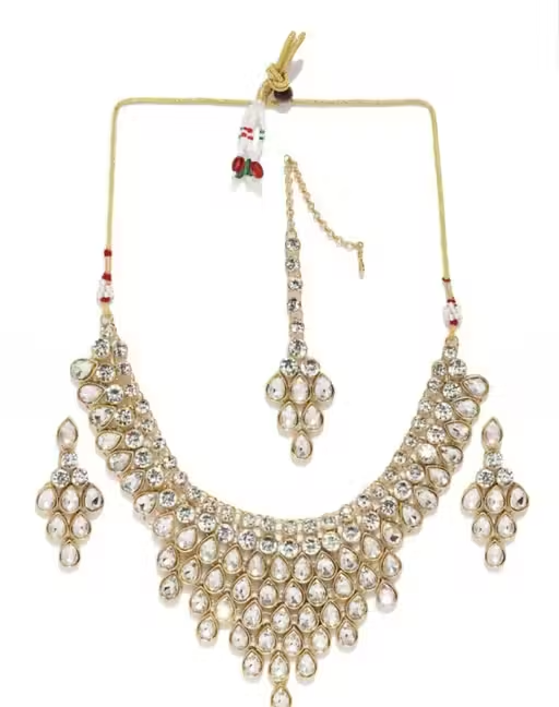 The set includes a beautifully designed choker necklace, matching earrings, and a maangtika, all decorated with classic Kundan stones that add sparkle and elegance. The adjustable necklace ensures a comfortable and secure fit.