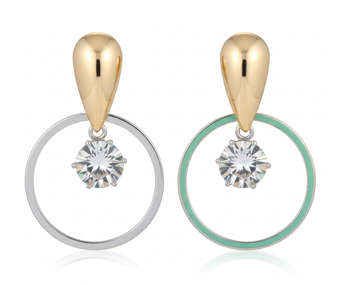 One earring comes with a classic silver ring, while the other has a trendy mint-green accent ring, giving a modern, fashionable look. Lightweight and stylish, these earrings are perfect for casual wear, office looks, parties, and gifting.
