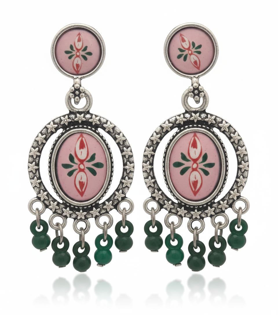 • Neeche green beads latke hue, jo earrings ko classy touch dete hain