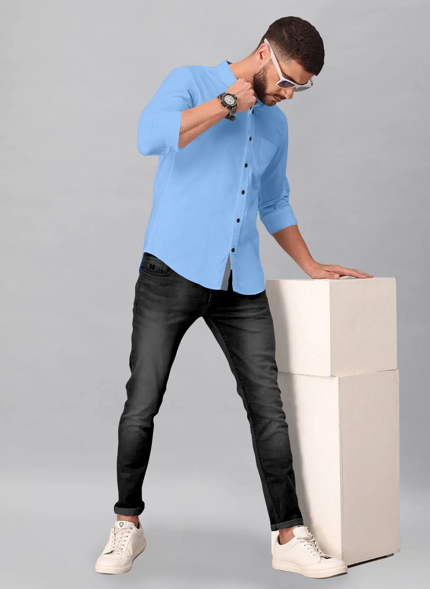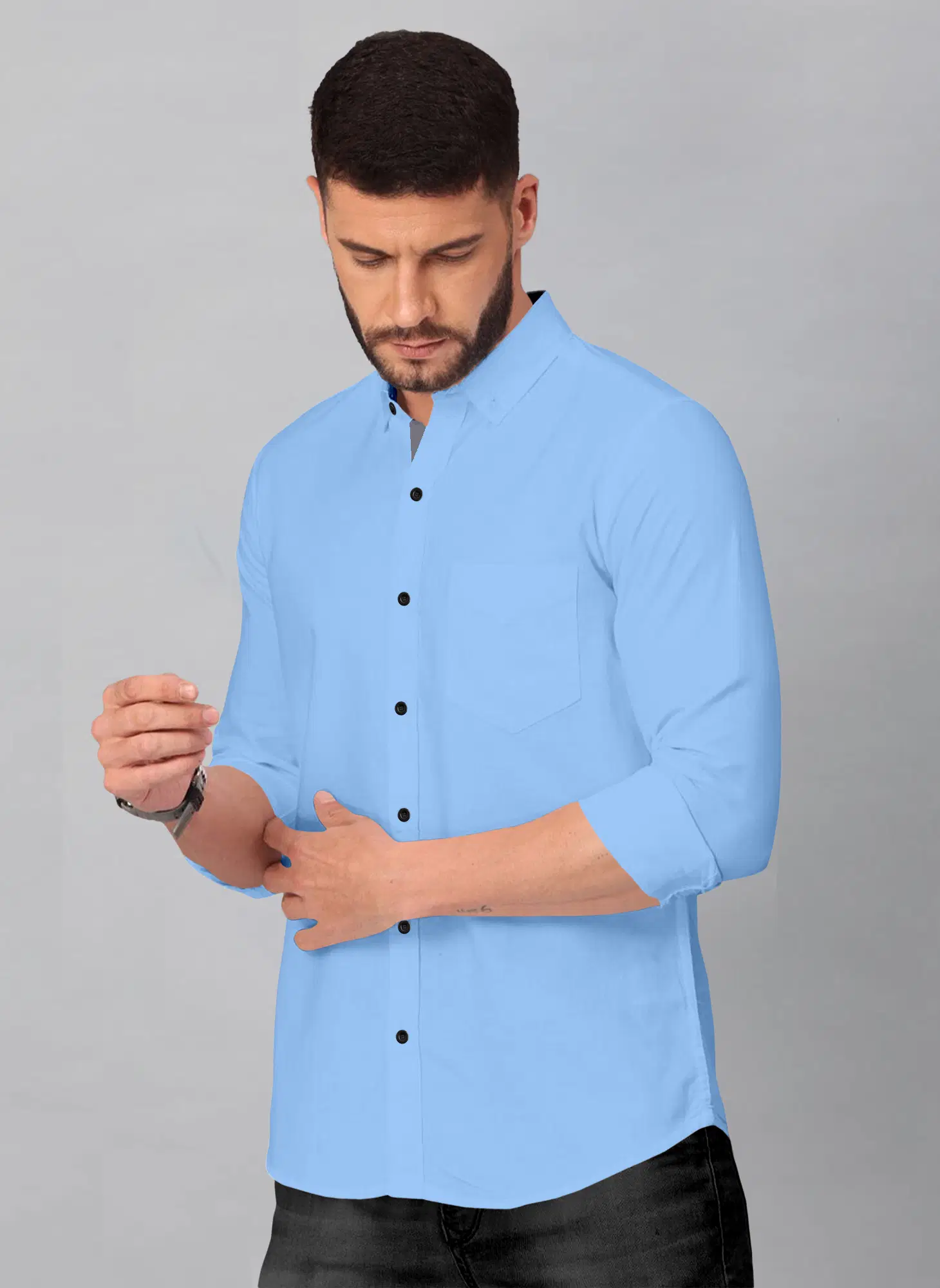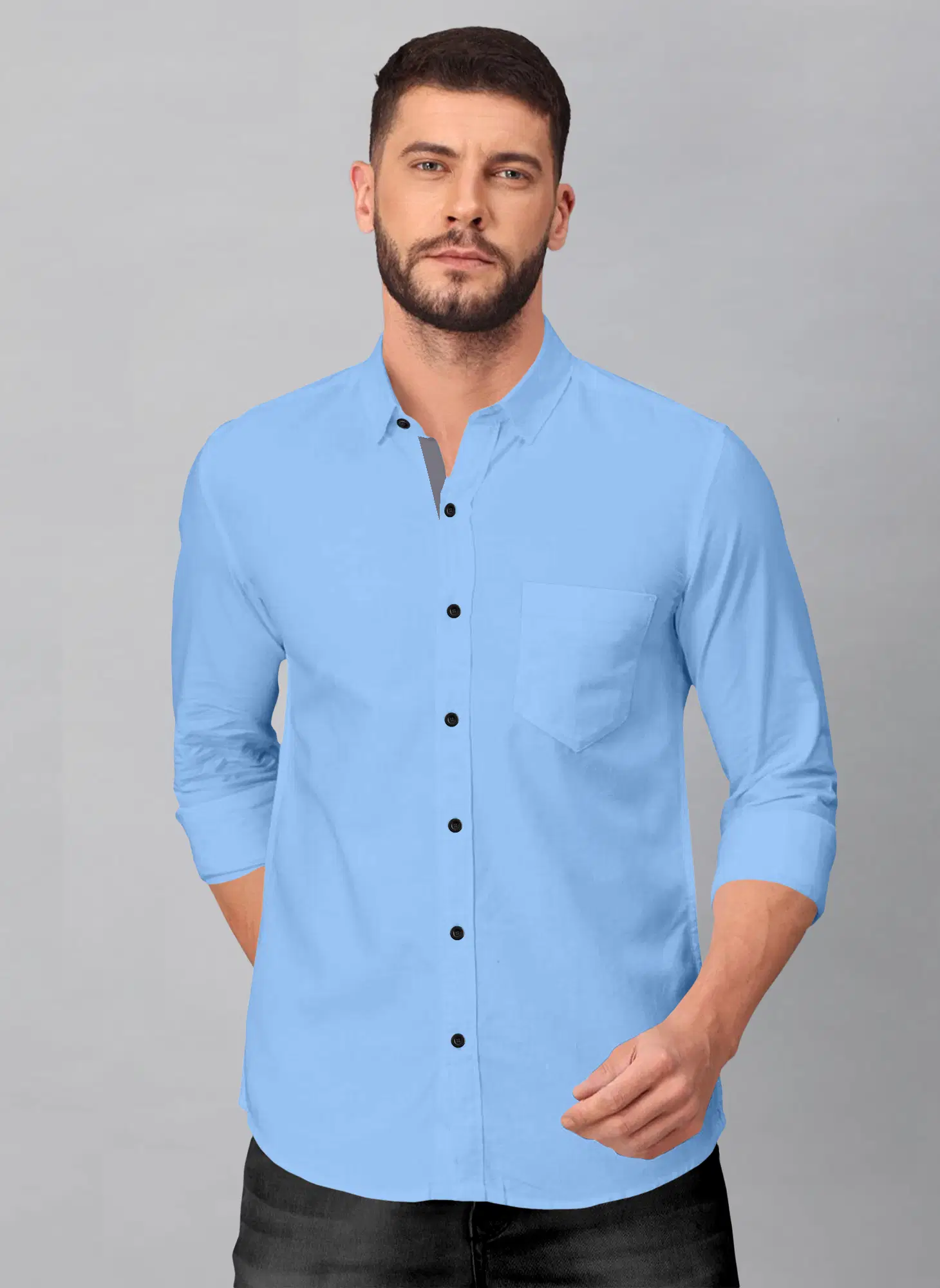 Ye men’s solid light blue Mandarin collar shirt ek fresh, clean aur modern look deta hai. Soft sky blue shade aur stylish Chinese collar design is shirt ko classy aur trendy banata hai. Premium quality breathable fabric se bana hua ye shirt din bhar comfort provide karta hai. Office wear, casual outings, summer wear ya smart day events ke liye ye ek perfect choice hai. Jeans, chinos aur formal trousers ke saath easily style ho jata hai.