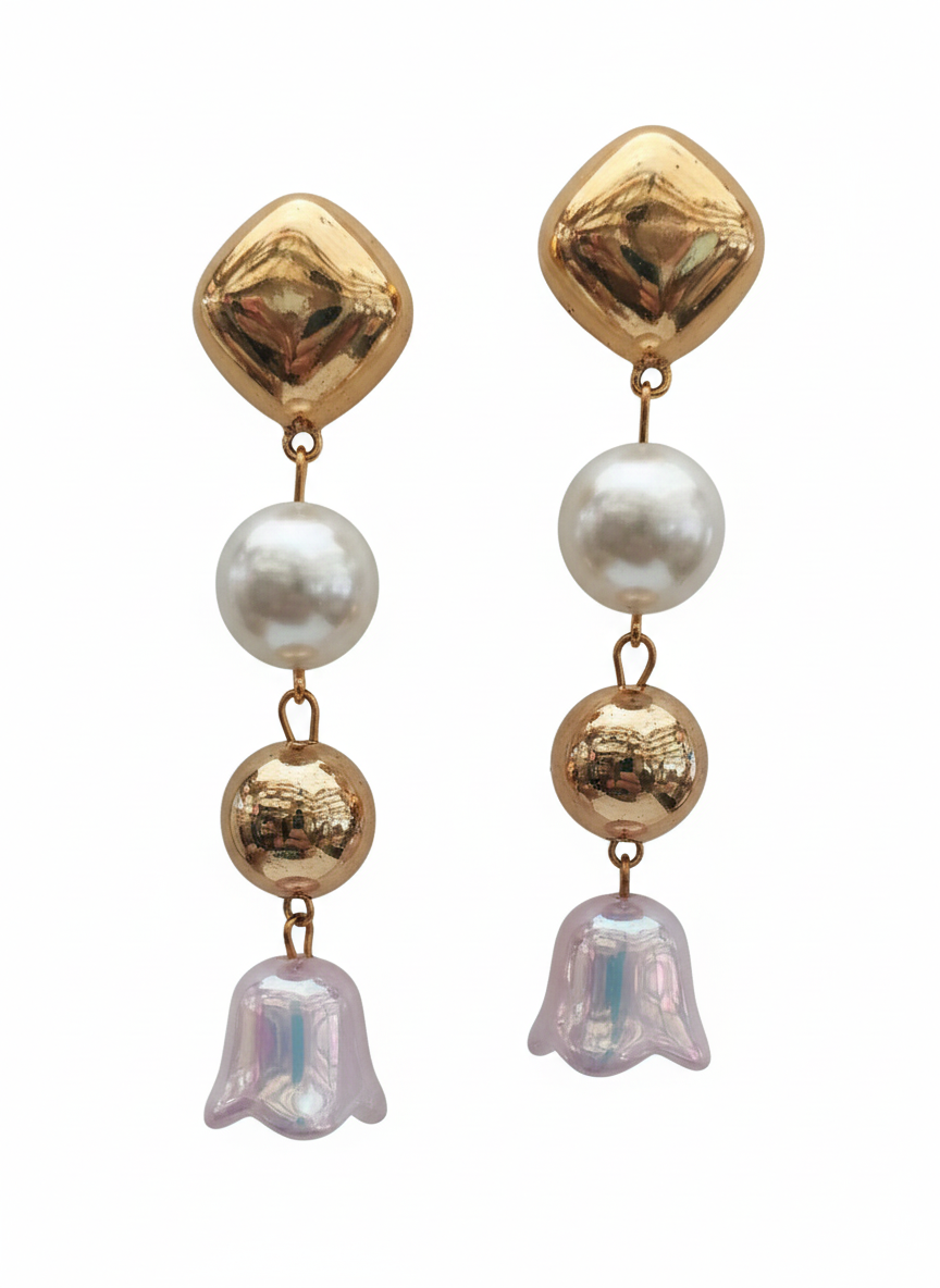 Add a graceful, trendy touch to your look with these beautiful beaded drop earrings. Designed with a glossy gold-tone top stud, these earrings feature a chic combination of a pearl bead, a shiny golden ball, and a stunning iridescent flower-shaped charm that gives a soft, dreamy finish.