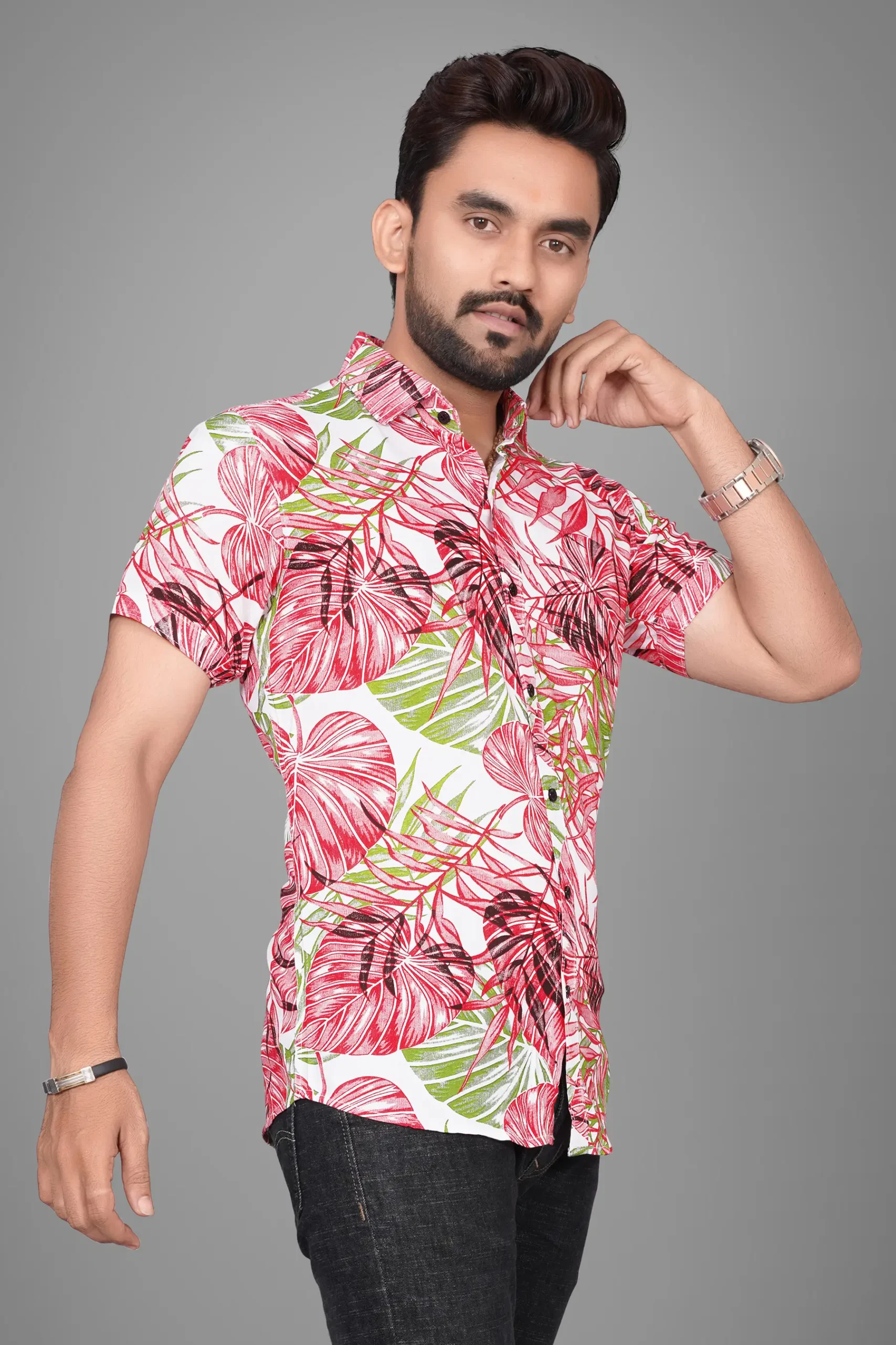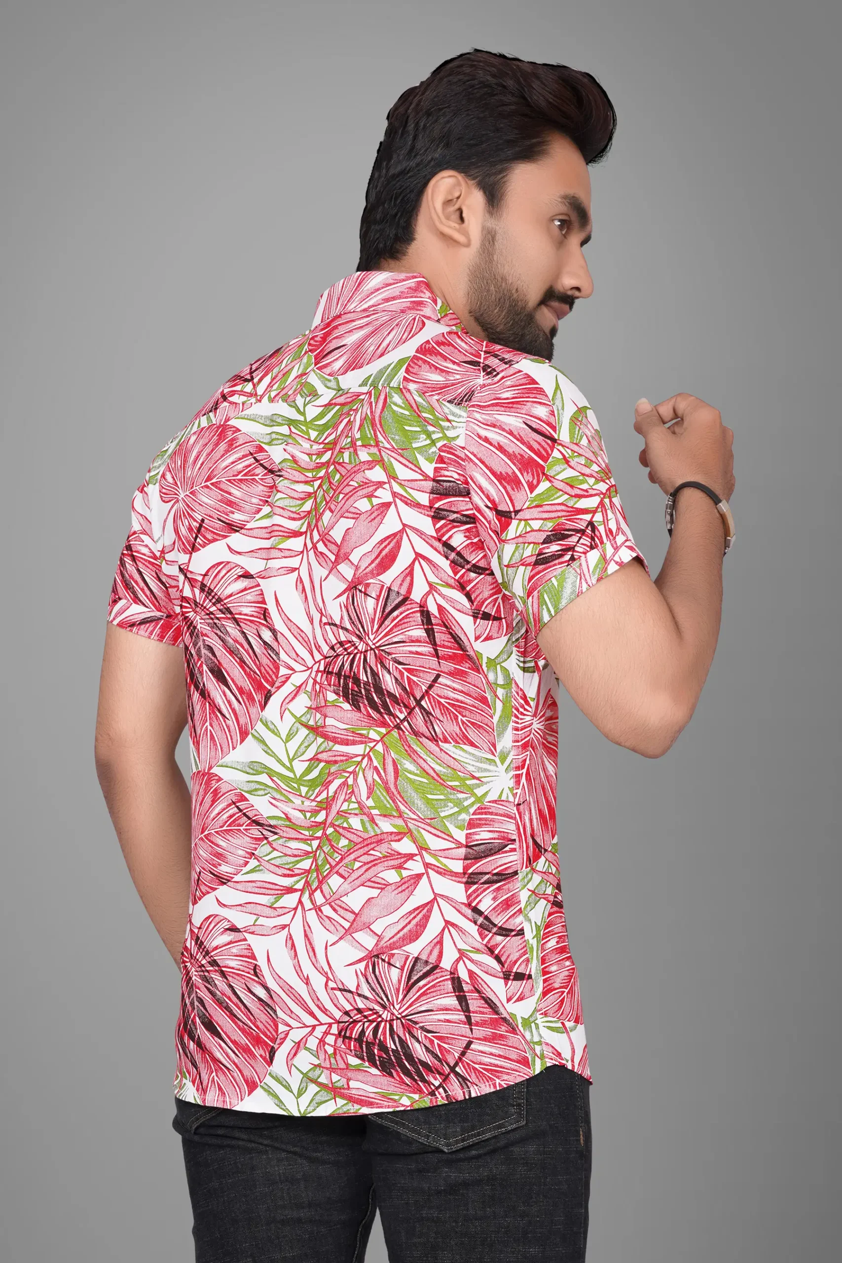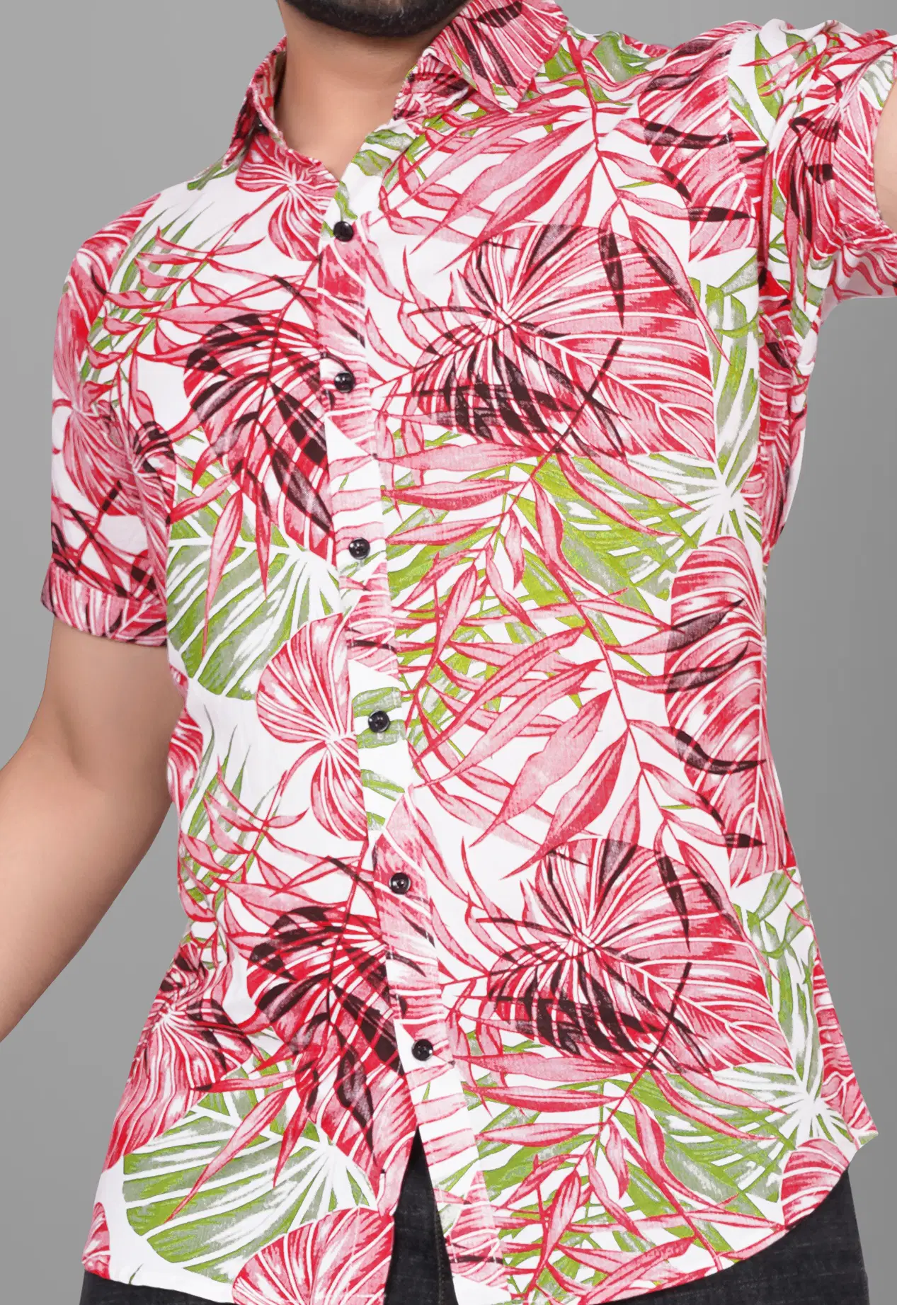 Ye menβs tropical printed half sleeve shirt bold red aur green leaf pattern ke saath ek classy summer look deta hai. White base par vibrant print shirt ko eye-catching aur stylish banata hai. Lightweight aur breathable fabric garmiyon me maximum comfort deta hai. Casual outings, beach wear, vacation trips aur summer parties ke liye ye shirt ek perfect choice hai. Jeans ya denim ke saath pehne aur instant fashionable look paye.