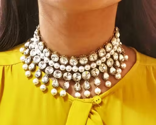 This elegant Kundan necklace set is designed to add a royal and graceful touch to your jewellery collection. Crafted from durable alloy with a gold-plated finish, it offers a rich shine and luxurious appearance.