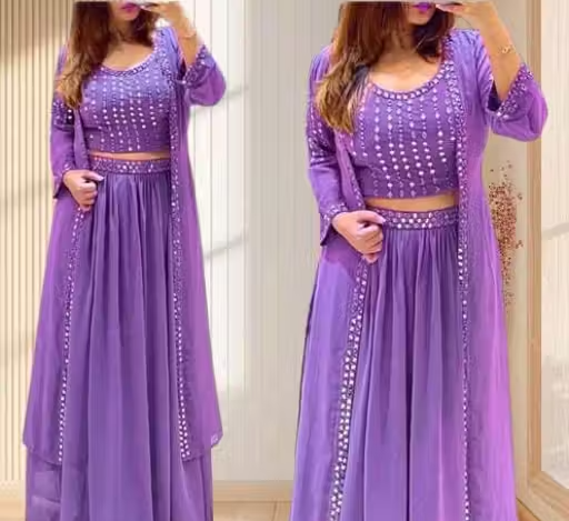 Step into elegance with this beautiful lavender pink gown set, crafted from premium georgette fabric. Designed in a stylish Indo-western pattern, this outfit features a solid top paired with a long flared skirt—perfect for weddings, parties, and festive occasions.