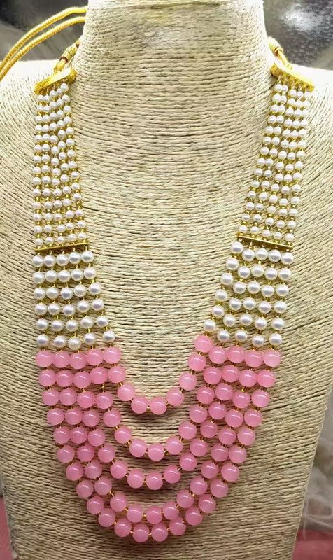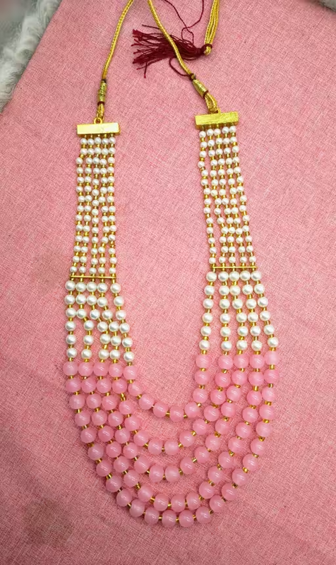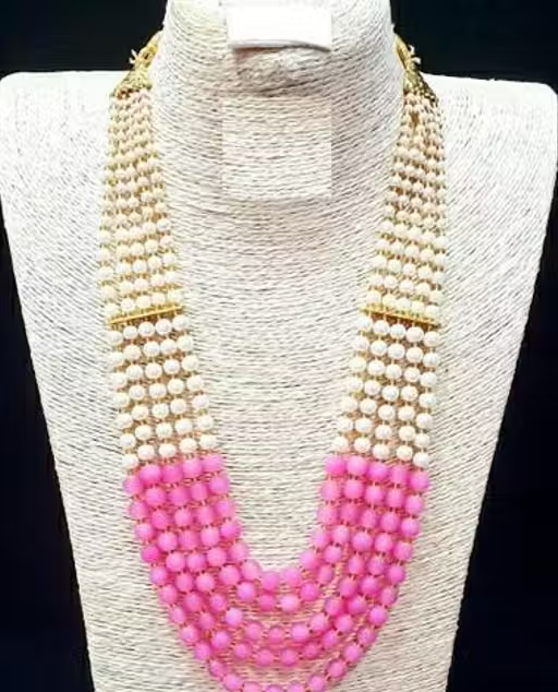 This trendy bead work necklace features a stylish 5-layer chain design that adds a fashionable and elegant touch to your look. Crafted with glass beads and pearl-style accents, the necklace offers a unique and eye-catching appearance.
