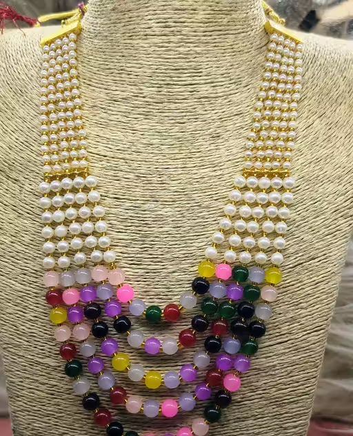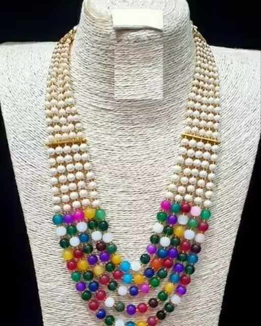 This trendy bead work necklace features a stylish 5-layer chain design that adds a fashionable and elegant touch to your look. Crafted with glass beads and pearl-style accents, the necklace offers a unique and eye-catching appearance.