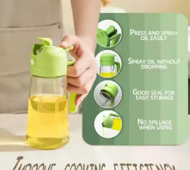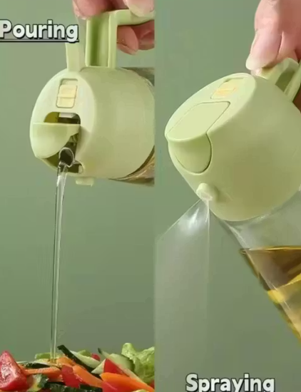 2 In 1 Functionality: Combines the features of an oil sprayer and a dispenser bottle, providing versatility for various cooking needs such as spraying or pouring oil as required.
