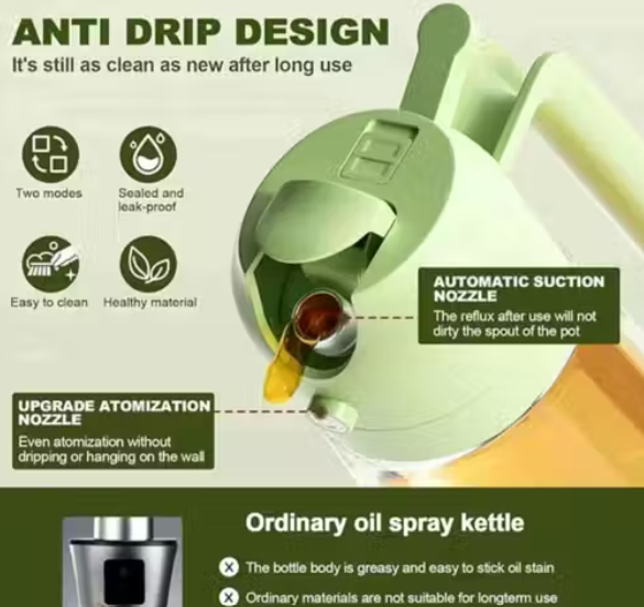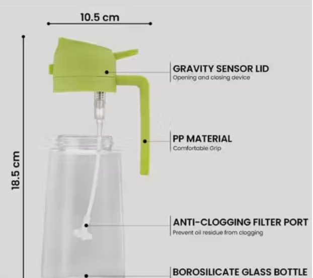 User-Friendly: Designed for ease of use with a simple spray mechanism and a controlled pour spout, allowing for precise and controlled dispensing of oil, reducing wastage and ensuring even coverage.