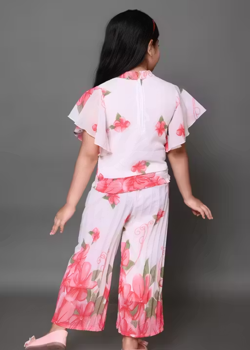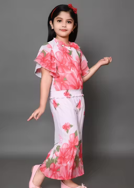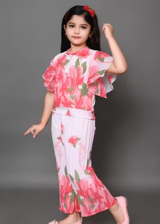 Dress your little girl in style with this beautiful sharara and tunic set. Made from lightweight chiffon fabric, this outfit is soft, breathable, and perfect for all-day comfort. The stylish printed design and short sleeves give it a trendy and elegant look, making your child stand out like a star.