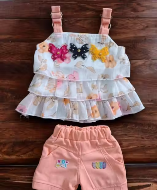 Upgrade your little girl’s summer wardrobe with this stylish and comfortable top and bottom set. Made from a soft nylon and cotton fabric combination, this outfit is lightweight, breathable, and perfect for all-day wear. The shoulder strap design adds a trendy touch, while the printed top paired with a solid bottom gives a cute and modern look.