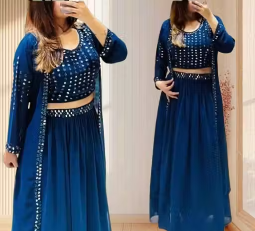 Add a royal touch to your festive look with this elegant morpich color gown set, crafted from premium georgette fabric. Designed in a stylish Indo-western pattern, this outfit includes a chic top and a long flared skirt, perfect for weddings, parties, and special occasions.