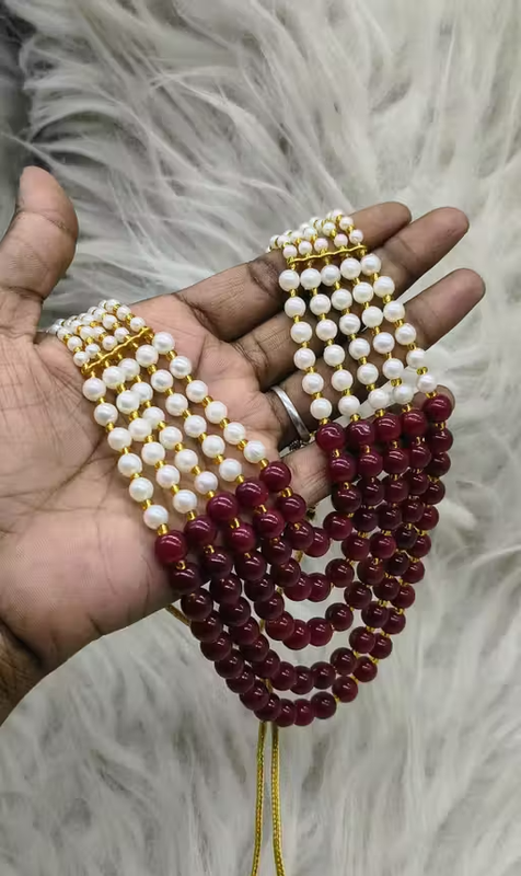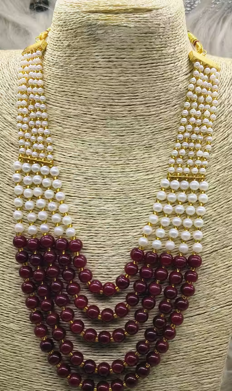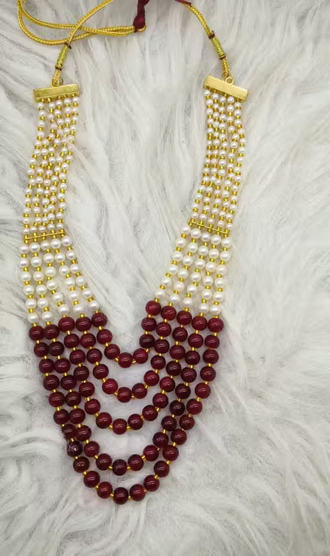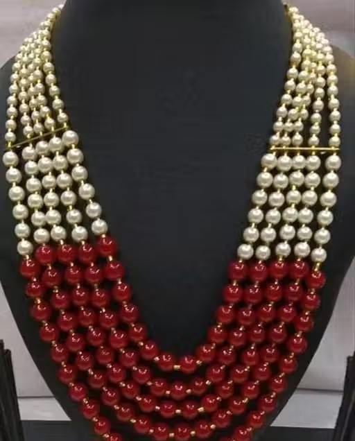 This trendy bead work necklace features a stylish 5-layer chain design that adds a fashionable and elegant touch to your look. Crafted with glass beads and pearl-style accents, the necklace offers a unique and eye-catching appearance.