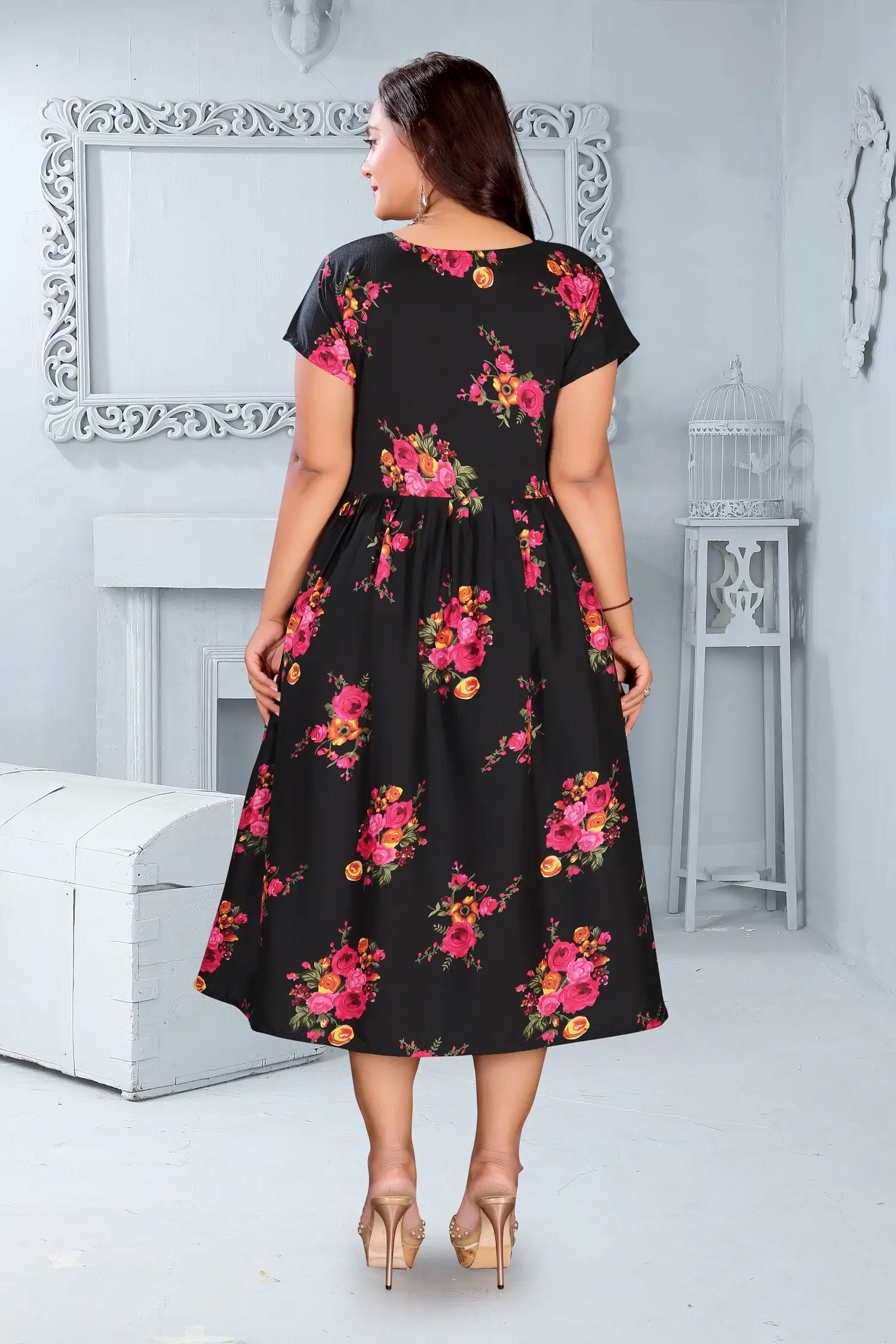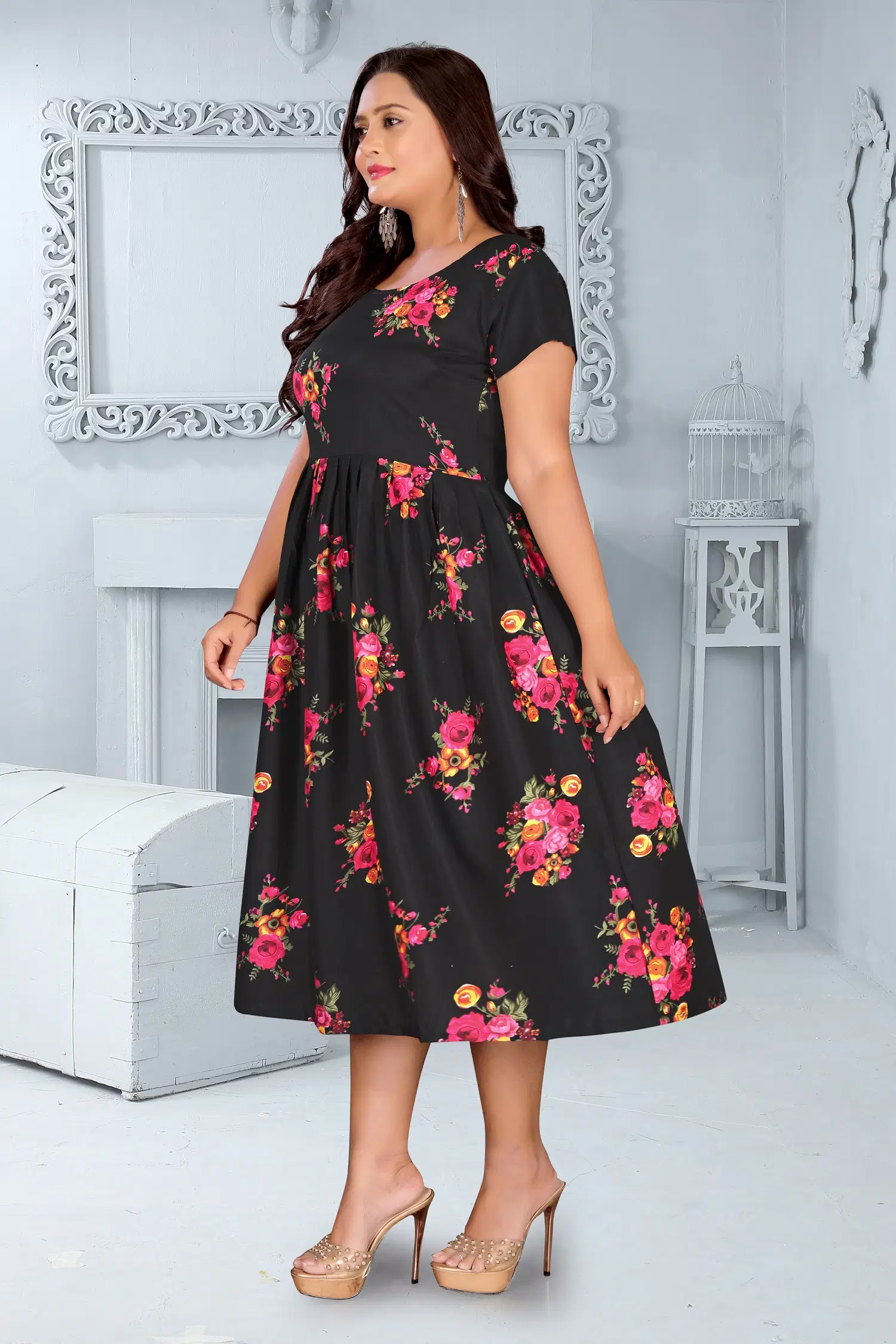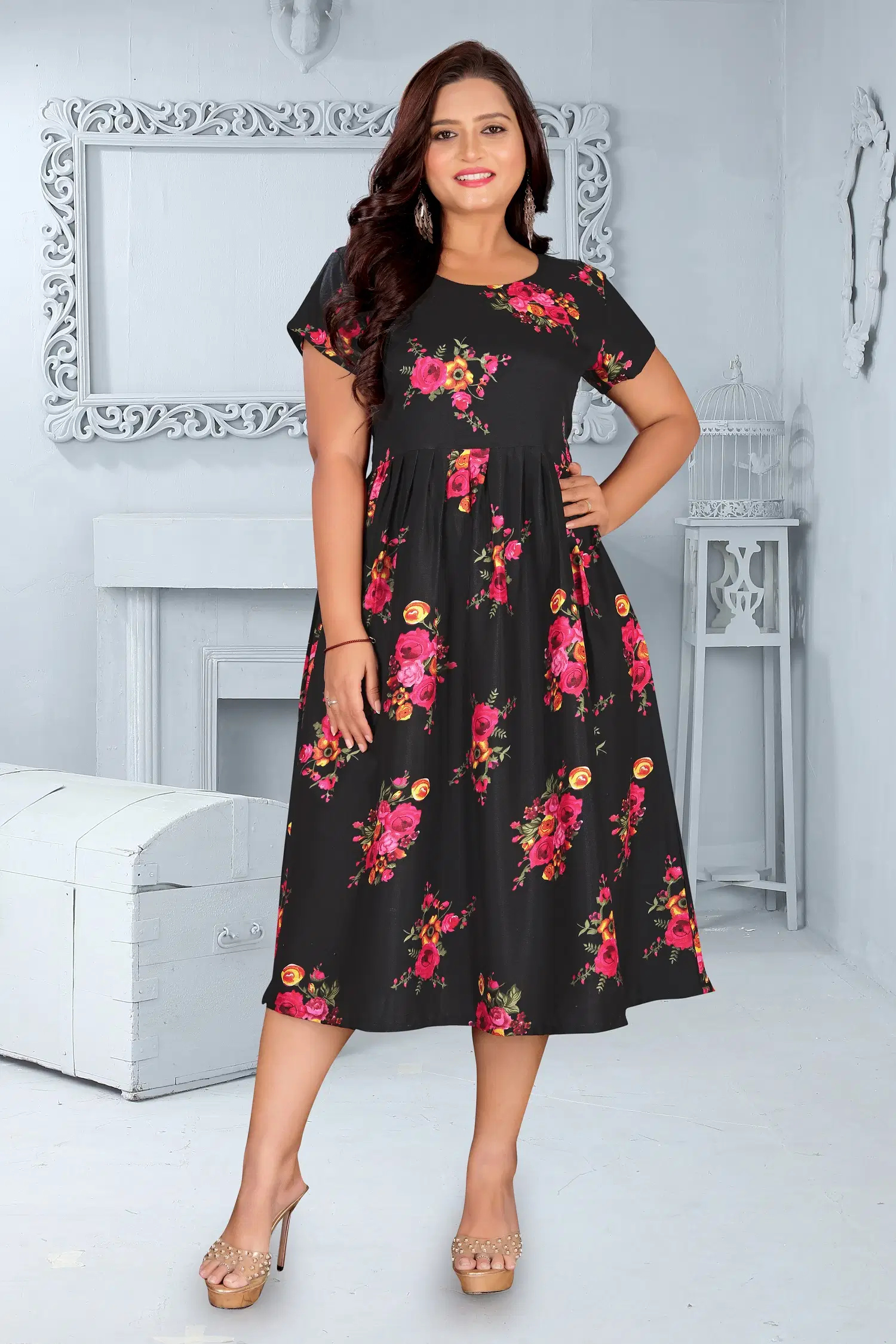 Designed in a flattering calf-length Anarkali silhouette, this kurta features cap sleeves and a round neck for a clean, elegant look. The printed detailing on a solid base adds subtle sophistication, perfect for day events, gatherings, or evening outings.