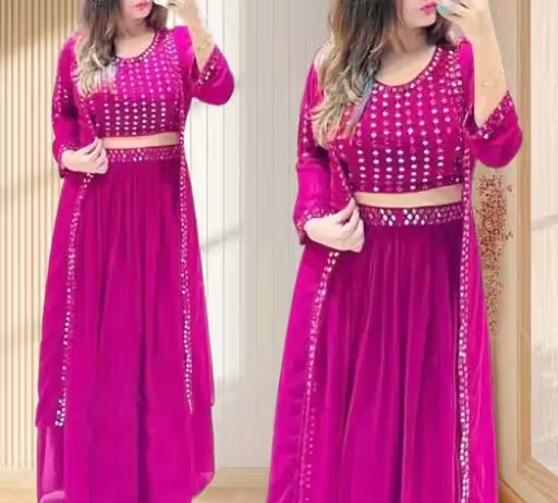 Step into elegance with this stunning Rani color gown set, crafted from premium georgette fabric. Designed in a trendy Indo-western style, this outfit features a stylish top paired with a long flared skirt with lace detailing, perfect for weddings, parties, and festive occasions.