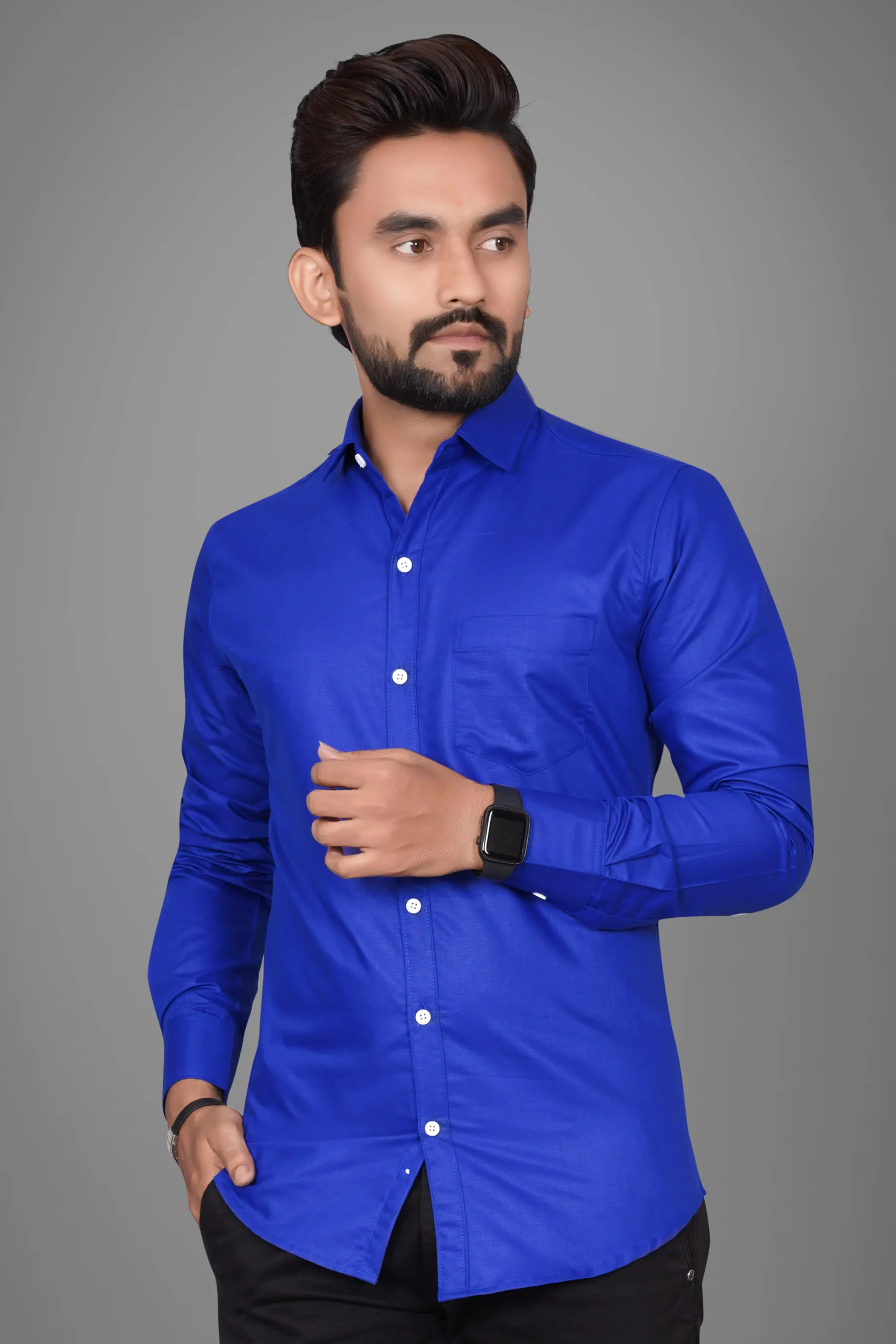 Ye men’s solid royal blue shirt ek bold aur premium look ke liye design ki gayi hai. Royal blue color classy hone ke saath-saath confident aur stylish appearance deta hai. Soft aur breathable fabric aapko poore din comfort deta hai, chahe aap office mein ho ya casual outing par. Clean solid design aur smart fit is shirt ko daily wear se lekar party wear tak ke liye perfect banata hai.