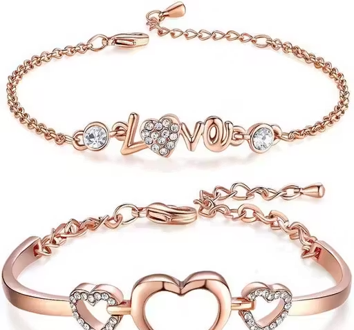 This elegant bracelet combo includes two stylish adjustable bracelets designed for girls and women. Crafted from durable alloy with a rose gold plated finish, these bracelets offer a beautiful shine and modern appearance.