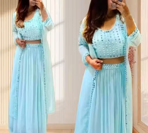 Step into elegance with this beautiful sky blue gown set, crafted from premium georgette fabric. Designed in a stylish Indo-western look, this outfit features a printed top paired with a long flared skirt with lace detailingβperfect for weddings, parties, and festive occasions.