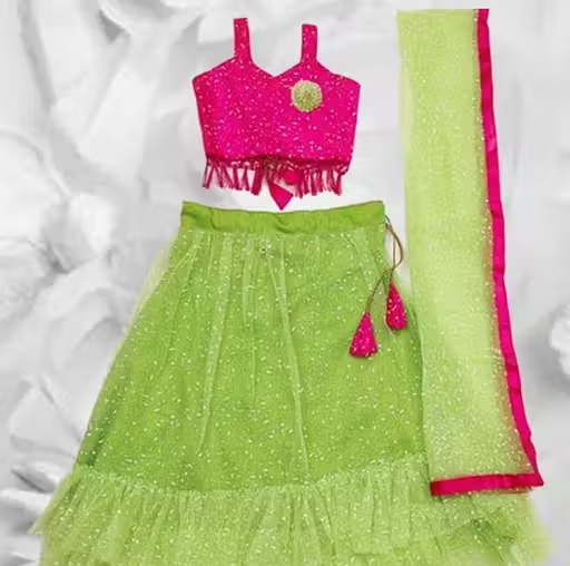 Make your little girl look adorable and festive-ready with this elegant lehenga choli and dupatta set. Crafted from premium net fabric with a soft cotton inner, this outfit ensures both comfort and a rich traditional look. The beautiful embellished design with butta patch work on the choli adds a stylish and festive appeal.