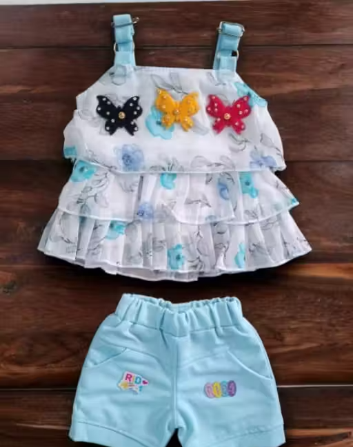 Give your little girl a cute and stylish look with this summer comfy top and bottom set. Made with a combination of soft nylon and cotton fabric, this outfit ensures comfort, breathability, and a lightweight feel for all-day wear. The shoulder strap design adds a trendy touch, while the printed top paired with a solid bottom creates a perfect stylish balance.