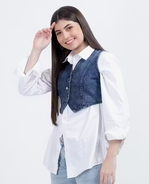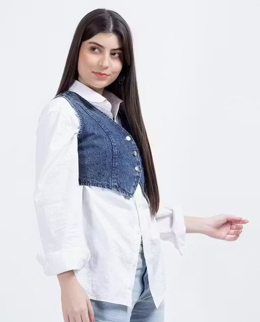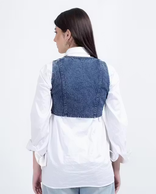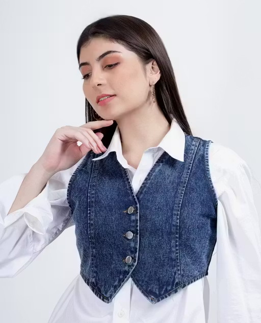 Upgrade your style with this trendy sleeveless denim jacket designed for women. Made from soft and durable denim fabric, it ensures comfort along with a fashionable look.