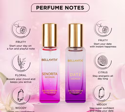 The Date fragrance provides a warm and romantic aroma with soft floral and sweet undertones. The Senorita fragrance delivers a fresh and lively scent with light citrus and floral notes. Together, they create a versatile fragrance set suitable for everyday use as well as special occasions.
