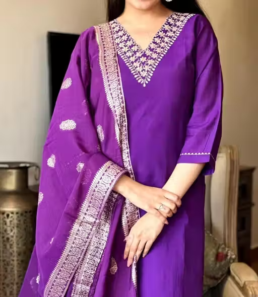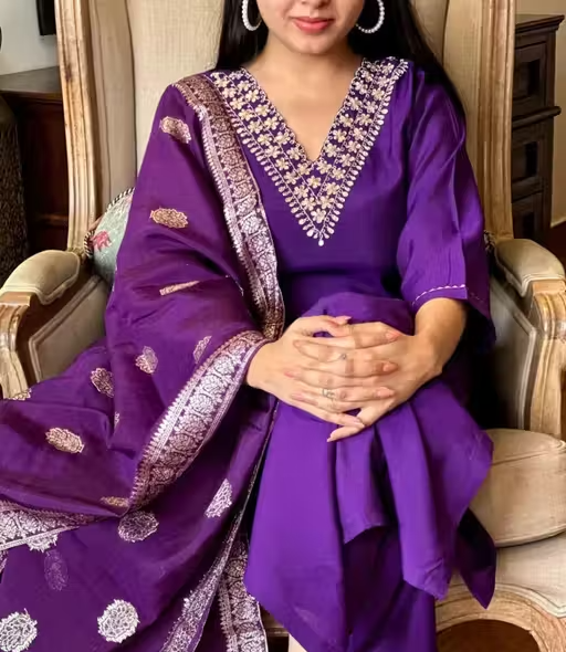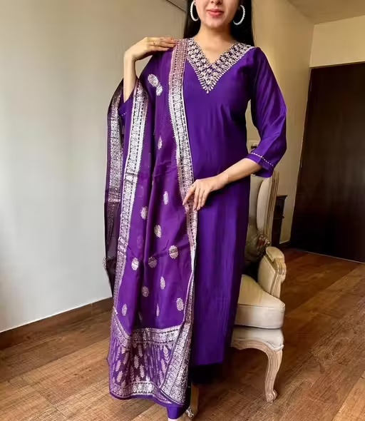 Add a touch of elegance to your ethnic collection with this stunning violet kurta set. Crafted from soft and breathable rayon slub fabric, the straight-fit kurta features delicate embroidery that enhances its graceful look. It is paired with matching pants and a lightweight Chanderi cotton dupatta, giving the outfit a rich and festive appeal.